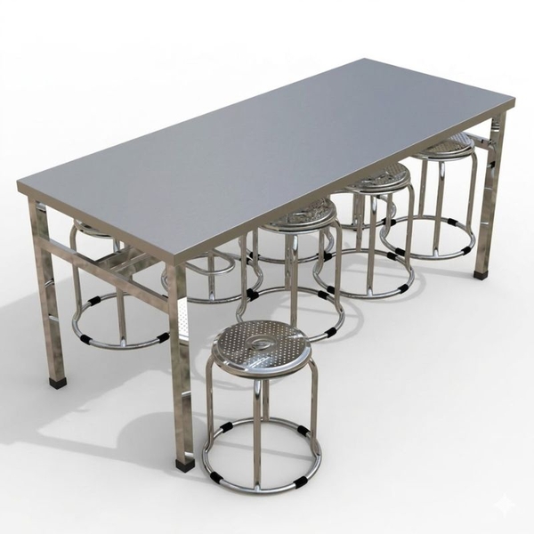 + Mặt bàn inox tấm được tạo hình bằng máy chấn thuỷ lực, đường nét sắc sảo, chắc chắn. Có tăng cứng mặt bàn