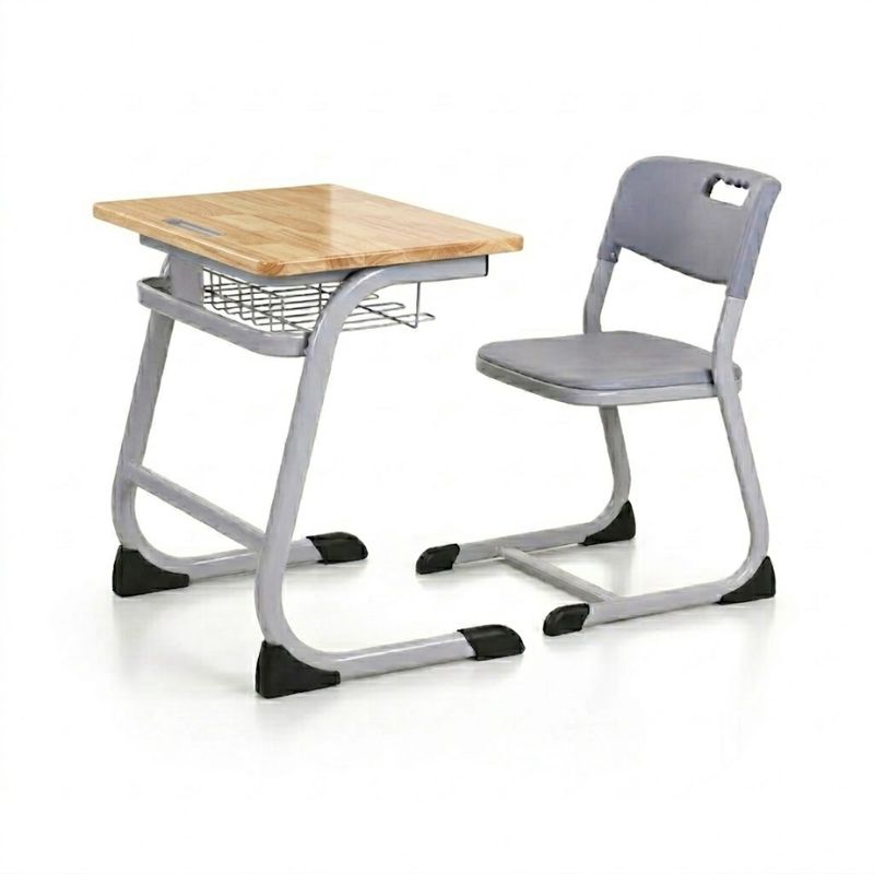 Hệ thống guốc nhựa an toàn: Chân bàn được bọc nhựa PP nguyên sinh bo tròn đầu, có cơ chế ôm góc ốp chắc chắn nghiêng về phía học sinh, ngăn chặn hoàn toàn việc bàn bị lật khi học sinh ngồi tì lực mạnh.