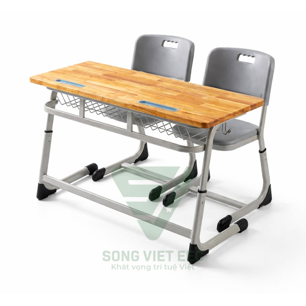 Bàn học sinh S-study ergonomic 2 chỗ ngồi mặt gỗ cao su là sự kết hợp hoàn hảo giữa vẻ đẹp bền vững của gỗ tự nhiên và công nghệ cơ khí hiện đại. Được sản xuất trực tiếp tại Nhà máy Sông Việt EEC, sản phẩm này là giải pháp đầu tư "Một lần dùng trọn đời" cho các trường Quốc tế, trường Tư thục chất lượng cao và các phụ huynh kỹ tính.