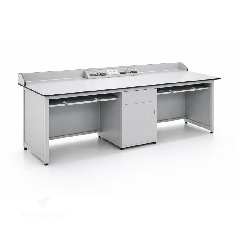 Kết cấu khung sắt mạ kẽm: Khung sắt hộp 30x30x1.2mm sơn tĩnh điện, kết hợp ván quây MDF cốt xanh phủ Melamine 17mm tạo độ vững chãi, chống rung lắc khi đặt các thiết bị đo lường chính xác.