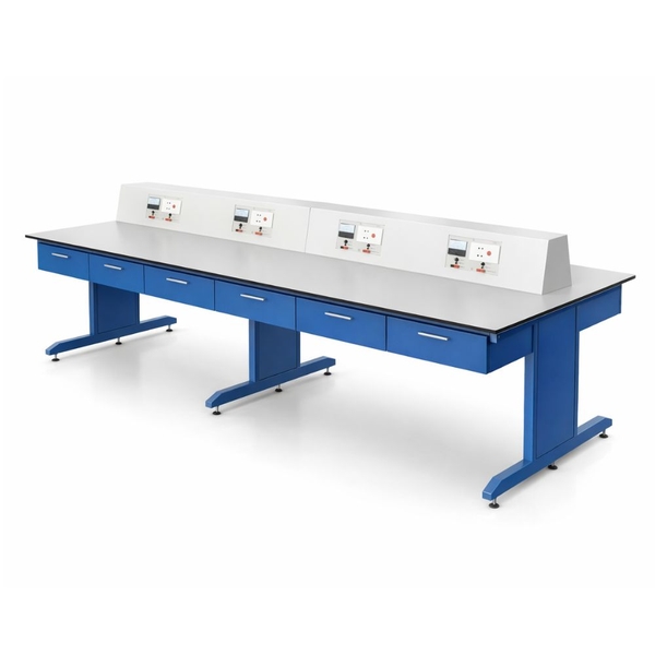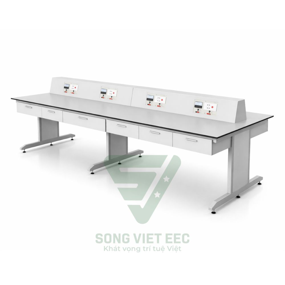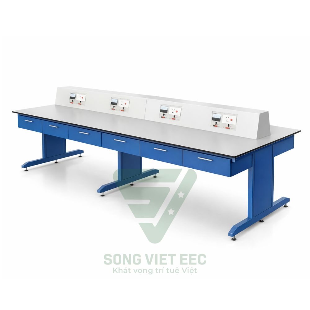 Bàn thí nghiệm Vật lý - Công nghệ trung tâm 8 chỗ ngồi là "trái tim" của các phòng thực hành hiện đại. Với kích thước lớn 2400x1200mm và hệ thống cung cấp nguồn điện thông minh tích hợp ngay trên mặt bàn, sản phẩm của Nhà máy Sông Việt EEC cho phép 8 học sinh cùng thao tác lắp ráp mạch điện, thực hành định luật Ohm hay các bài tập công nghệ một cách an toàn và chính xác.