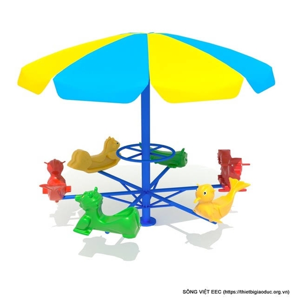 Đu quay gồm 6 ghế ngồi bằng thép, đu quay được thiết kế cho trẻ tự vận hành, mái che bằng vải .
